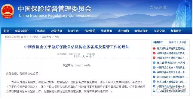 為深入貫徹國務院關于深化簡政放權、放管結合、優化服務改革意見精神,落實《中華人民共和國資產評估法》(以下稱《資產評估法》),強化“設立保險公估機構審批”行政許可事項取消后的事中事后監管措施,切實做好保險公估機構業務備案及監管工作,促進保險公估行業健康穩定發展,現將有關事項通知如下: