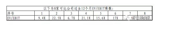 評估人員查找了同樣從事餐飲連鎖業務的可比公司,考慮了目標公司B的規模、經營區域和發展情況,選取了8家上市公司作為研究對象。