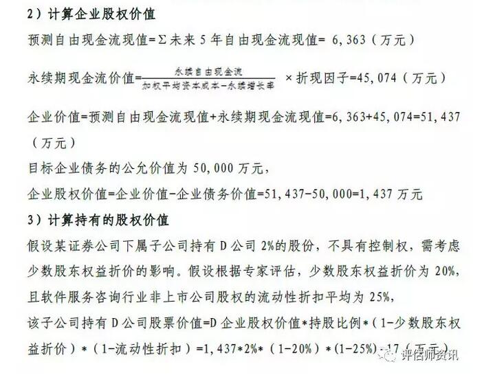 假設某證券公司下屬子公司持有 B 公司 2%的股份,且根據歷史數據統計分析,餐飲連鎖行業非上市公司股權的流動性折扣平均為 25%, 該子公司持有 B 公司股票價值=B 企業股權價值*持股比例*(1-流動性折扣)=85,549*2%*(1-25%)=1,283(萬元)
