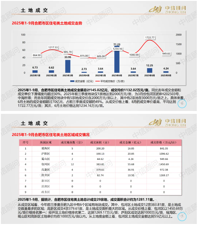 土地市場 | 2025年1-9月,合肥住宅用地成交29宗1181畝,平均地價1132萬元/畝