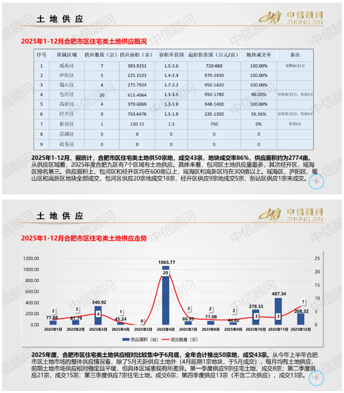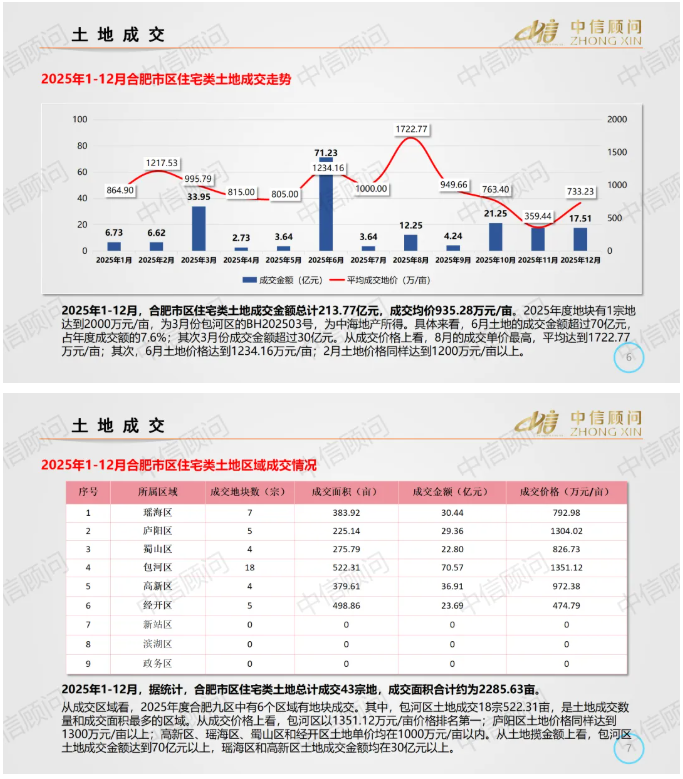 土地市場 | 2025年1-12月,合肥住宅用地成交43宗2286畝,平均地價935萬元/畝